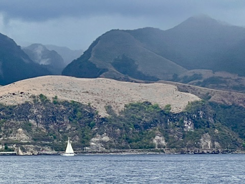 We motored the 60 nautical miles from St. Pierre, Martinique, to Portsmouth, Dominica, in the wind shadow created by Dominica’s tall mountains. It was a cloudy and misty day. The scenery reminded me of a moody Chinese Shan Shui (山水, “mountain-water”) painting.
