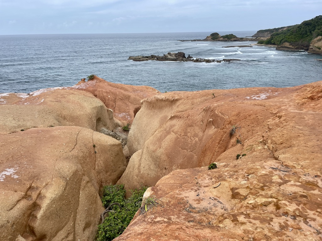 The entrance to the Red Rock scenic area is on the property of the Red Rock Cuisine restaurant. The restaurant has many outdoor tables under the shade and a bar that offers beer, fresh local juices, and various cocktails. I sampled a tamarind sorrel juice, which was delicious. From either the restaurant or the tree-lined trail entrance, we had no view of the scenic cliff or the bay. As such, we had little expectation of what we would find at the end of the trail. All at once, as we stepped out of the dense forest, we saw the unexpected, dramatic red vista and the Caribbean Sea beneath the cliff.