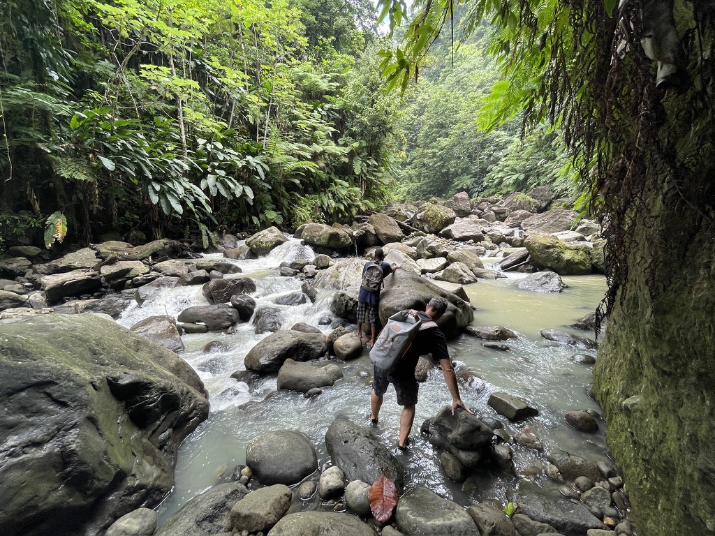 We hired a guide who met us in the town of Delices. The guide directed the car to a super-narrow dirt road and told the driver to park near a few private houses (shacks). That was the trailhead to the falls. No markings, no signs. We were very happy to have a guide. It felt like we were allowed into a local secret. Our hike to the falls was fun, at times tricky, but not terribly demanding, thanks to our guide’s excellent instructions. We climbed over slippery river rocks and waded across the stream three times. At the deepest, the water was at waist-deep. Surprisingly, the water was not as cold as at the other waterfalls we had visited. Our guide explained that this was because Victoria Falls is one of the outlets of the famous Boiling Lake.1